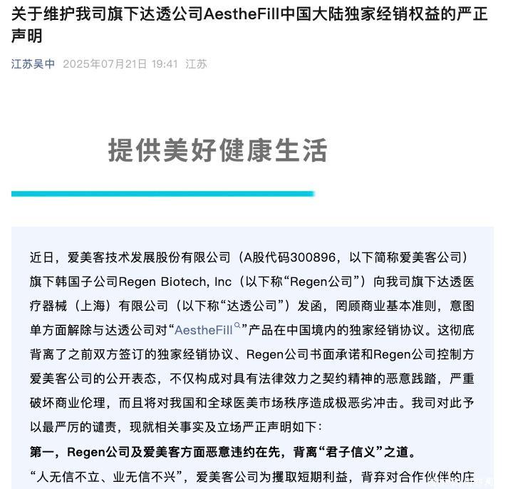 *ST苏吴在其公众号上发布《严正声明》的言辞更为锋利,该公司称:爱美客及其控股子公司韩国REGEN公司“罔顾商业基本准则,意图单方面解除与达透公司对AestheFill产品在中国境内的独家经销协议”。