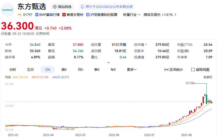 值得注意的是,从7月开始,东方甄选股价一路上涨成为港股市场表现亮眼的牛股,从7月初的11港元/股左右最高攀升至53.7港元/股,创2023年2月以来新高,尽管本周股价略有回调,但是截至8月22日收盘该股仍报36.3港元/股,股价累计涨幅超过200%,市值约380亿港元。