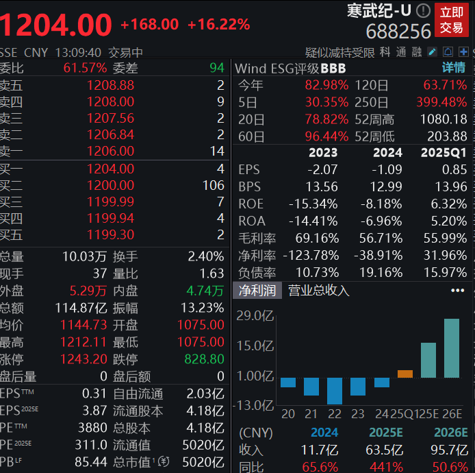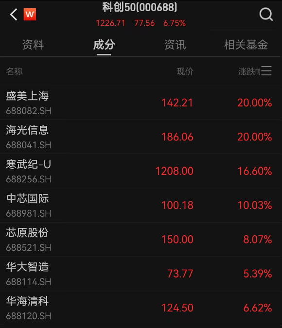 从板块来看,算力芯片概念股爆发,午后,截至13:14,科创50指数大涨超6%,盛美上海、海光信息涨停,寒武纪涨超16%,股价突破1200元关口,市值破5000亿。中芯国际股价再度站上百元大关,涨超10%。