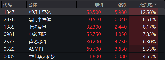 港股半导体概念股集体走强,截至13:14,华虹半导体涨超12%,上海复旦、中芯国际上涨超7%。